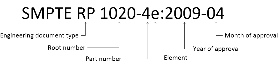Document numbers shall be unique and uniform across all Engineering Document types. Versions of documents shall be identified by the year and month of their approval date, appended with a separating colon (e.g., for document #1020: 1020:2009-04 indicating approval in April, 2009). Figure 1 shows an example of the document numbering structure. The approval date of a document indicates when it was last approved by its consensus body, e.g., Technical Committee.